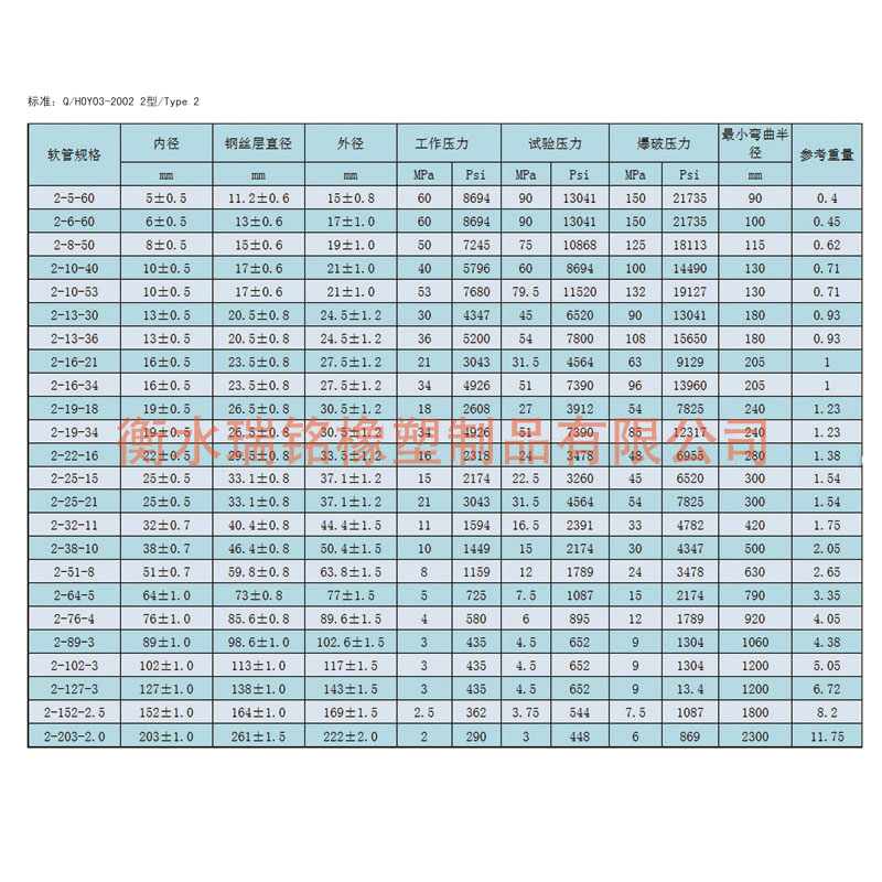 注:本企业钢丝编织胶管参照GB/T3683-1992标准设计制作,并可根据要求制作ISO/DIS1436-1985,DIN20022及SAE100RIAT,