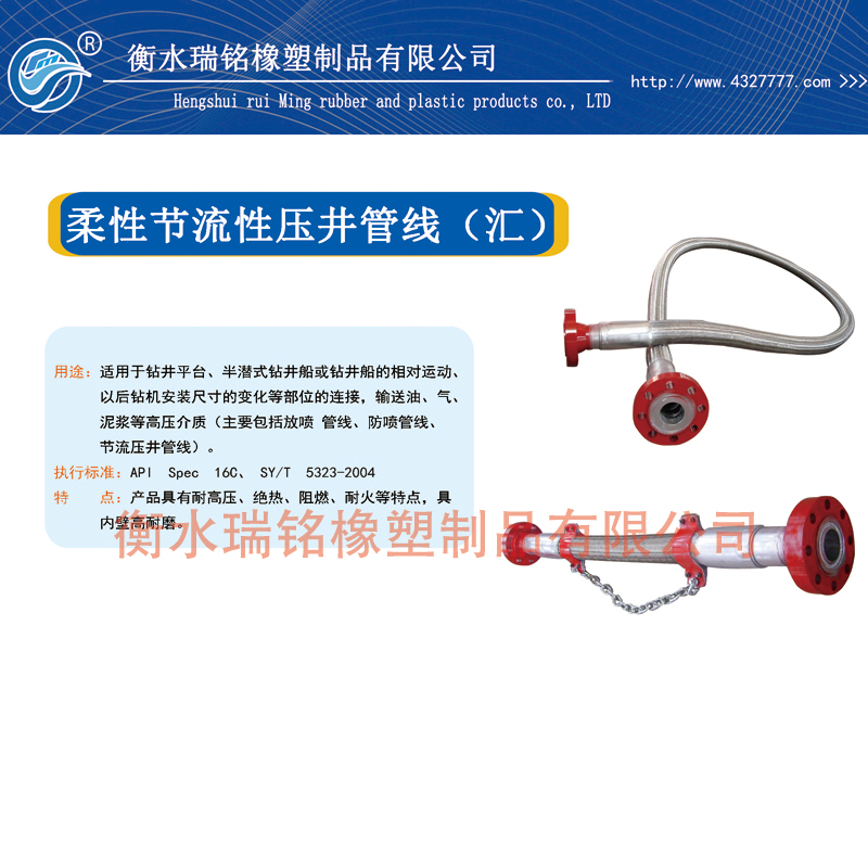 一、用途:主要用于内、外放喷管软连接,泥气体分离器与节流管汇之间的柔性连接,不但具有耐高压、绝热、阻燃、耐火等性能,而且内壁有着比钢管还耐磨的特高耐磨性。