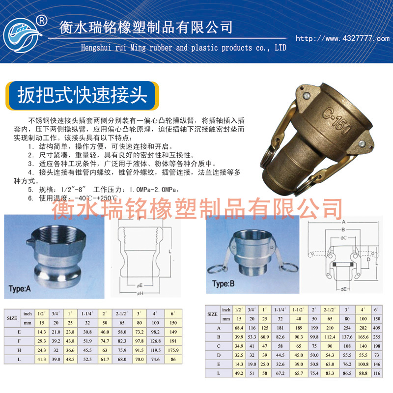 链接时:当子体插入母体时,套圈在弹簧的作用下回到原来的位置,钢珠滚动锁紧子体紧密连接,同时母体与子体的阀门互相推动而打开,流体流通,O型圈能完全阻断流体的渗漏。