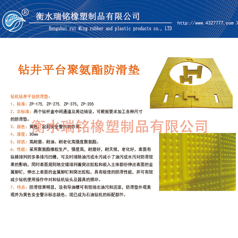 7、特点:防滑效果明显,设有导油槽可有效排出油污和泥浆,防滑垫外观美观并为黄色安全警示标志颜色。现已成为石油钻机的标配部件。