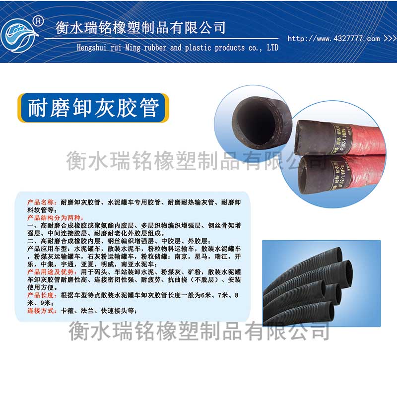 产品结构:散装水泥罐车卸灰胶管由高耐磨合成橡胶或聚氨酯内胶层、多层织物编织增强层、中间连接胶层、耐磨耐老化外胶层组成。