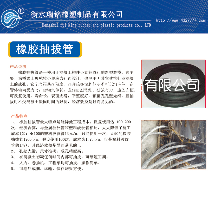 1、 橡胶抽拔管最大特点是能降低工程成本。反复使用达 100-200次,经济合算,与金属波纹管和塑料波纹管相比,大大降低了施工成本(如: ф100的塑料波纹管13元/m,只能使用一次; ф90的橡胶抽拔管170元/m,假设使用100次,成本为1.7元/m,仅是塑料波纹管的1/8),其经济效益是显而易见的 。