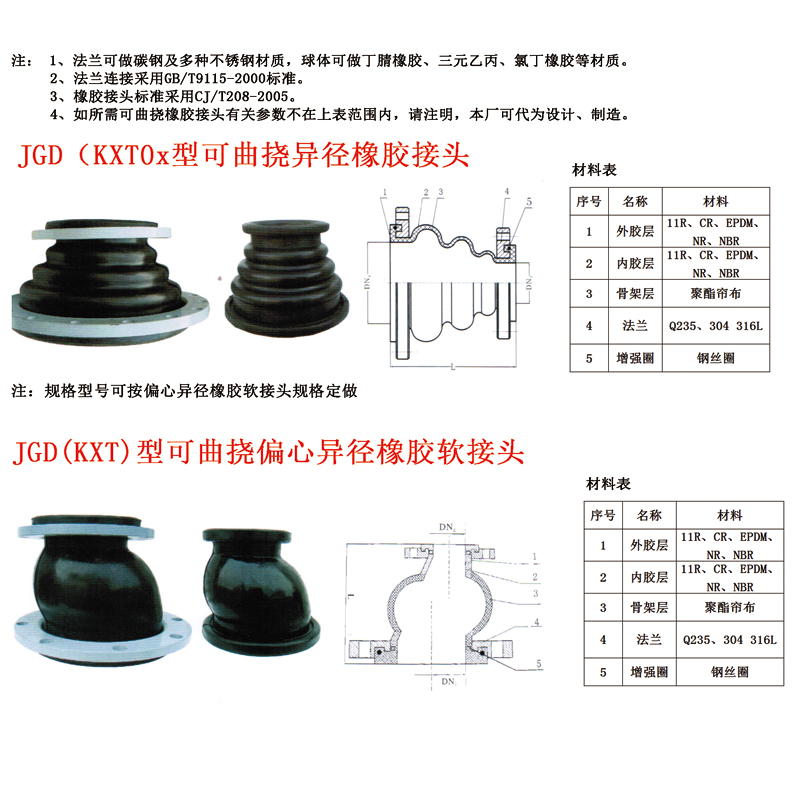 三、JGD-B型橡胶异径接头材质:根据介质不同所采用的橡胶材质也不同,有天然胶、丁苯胶、丁基胶、丁腈胶、三元乙丙胶、氯丁胶、硅橡胶、氟橡胶等等。分别具有耐热、耐酸、碱、耐腐蚀、耐磨、耐油等功能。