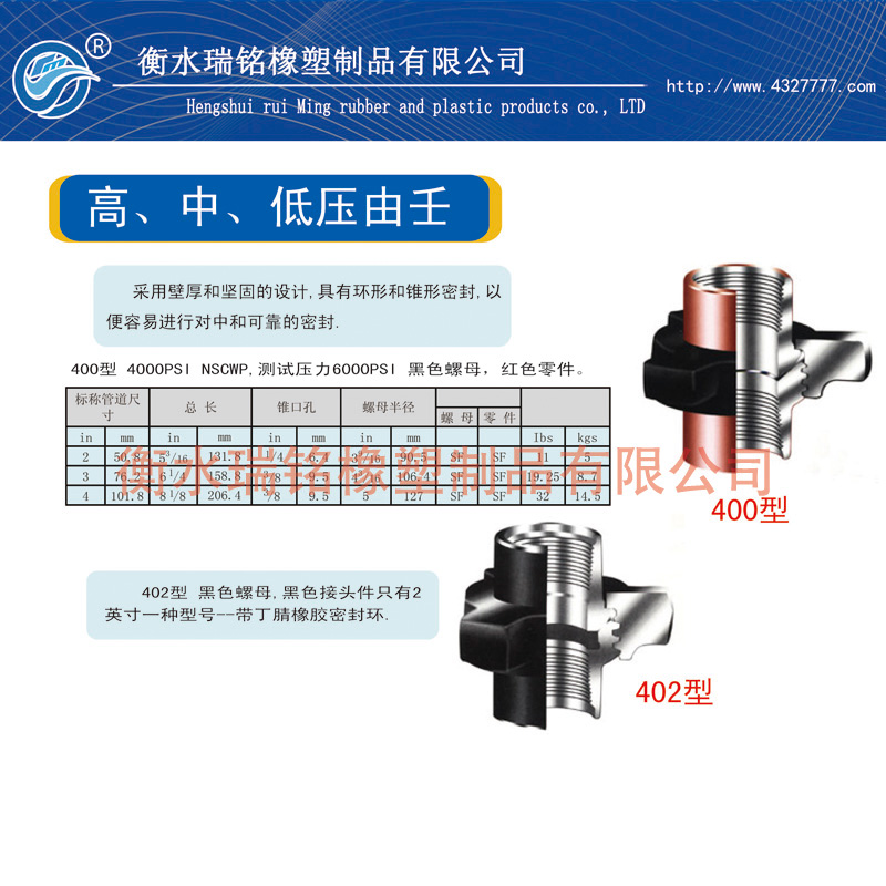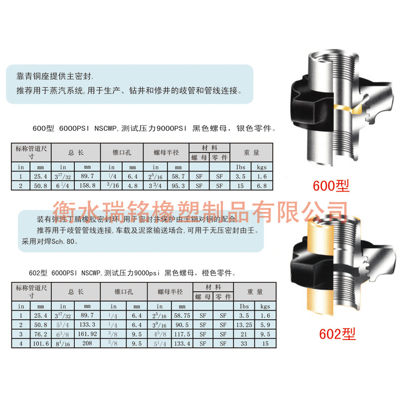 引进美国FMC,SPM公高压由壬引进美国FMC,SPM公司先进技术,采用合金钢铸造而成,严格的热处理确保接头有匀均一致的金相组织和承压能力,所使用材料完全符合美国ASTM和AISI标准,产品技术指标完全符合API Spec 6A标准,产品密封可靠、装卸快捷、通用互换性好。适用于空气,水,油,或汽车到500psi nscwp。标准接头螺纹API管线管。