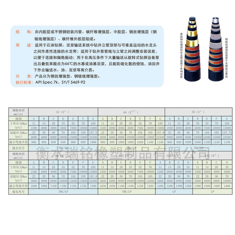 结构:由内胶层、内胶保护层、中胶层、钢丝缠绕层和外胶层组成。