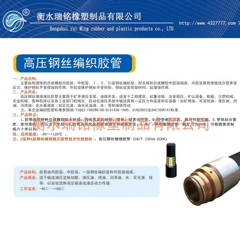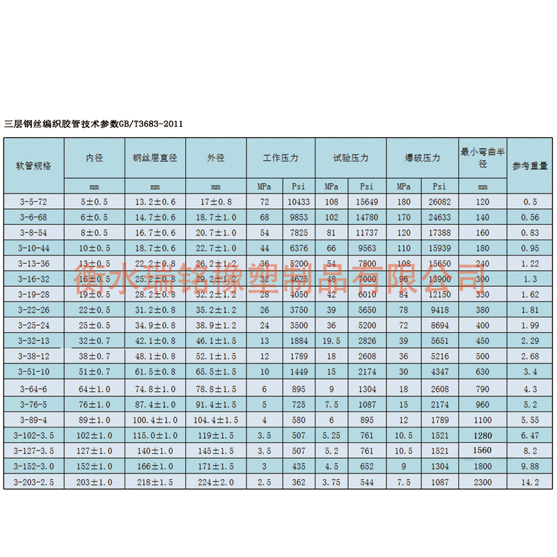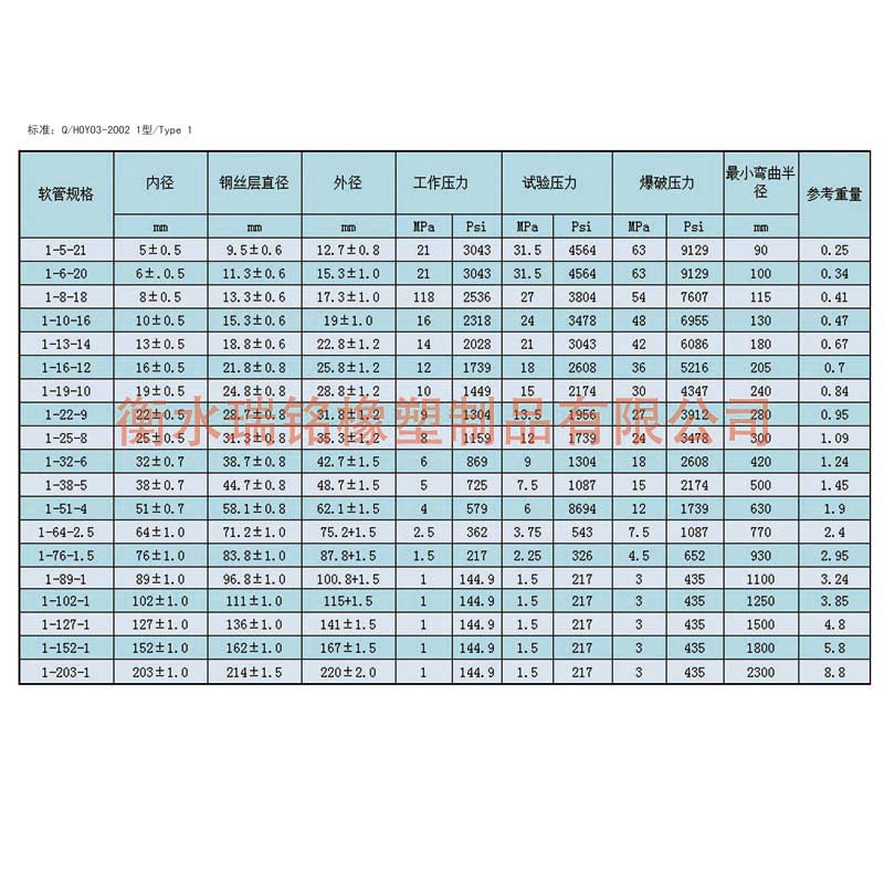 注:本企业钢丝编织胶管参照GB/T3683-1992标准设计制作,并可根据要求制作ISO/DIS1436-1985,DIN20022及SAE100RIAT,