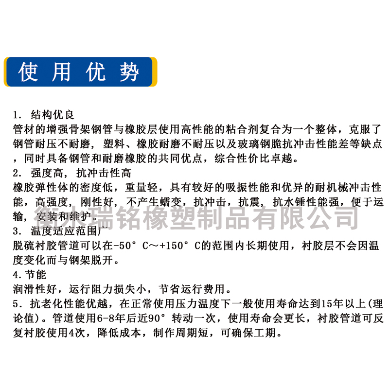 本产品柔韧性好,能适应各种地质情况,可直接弯曲铺设;采用法兰连接,无需衬垫片,连接快捷、简便.