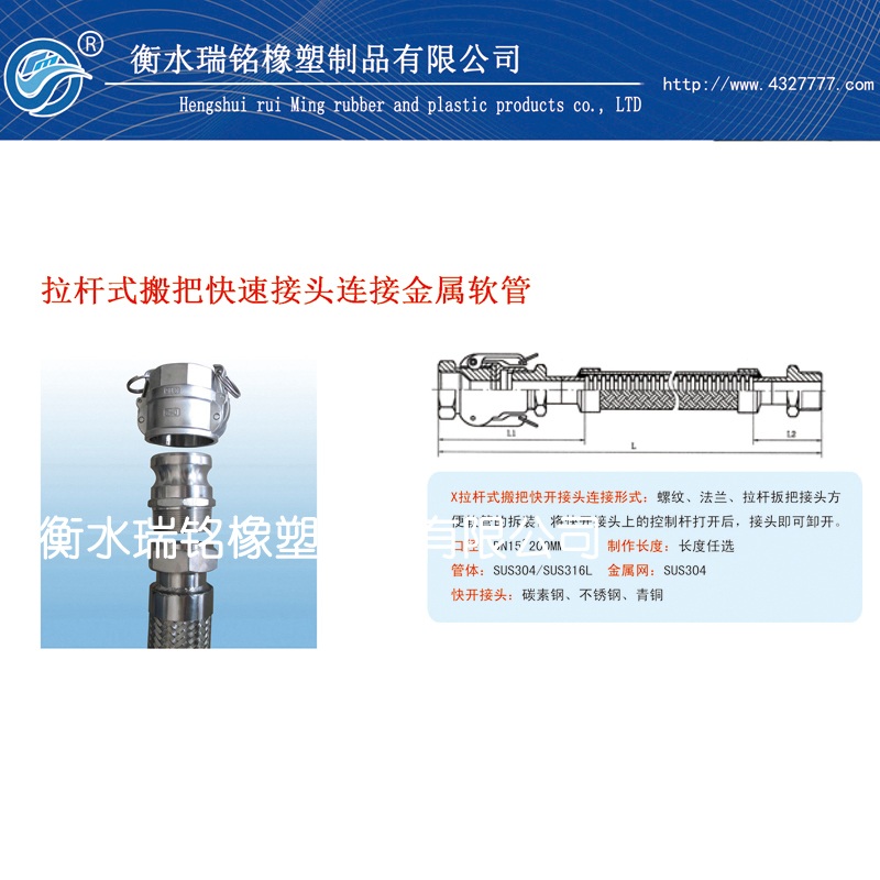 快速连接金属软管作为一种柔性耐压管件安装于液体输送系统中,用以补偿管道或机器、设备连接端的相互位移,吸收振动能量,能够起到减振、消音等作用,具有柔性好、质量轻、耐腐蚀、抗疲劳、耐高低温等多项特点。
