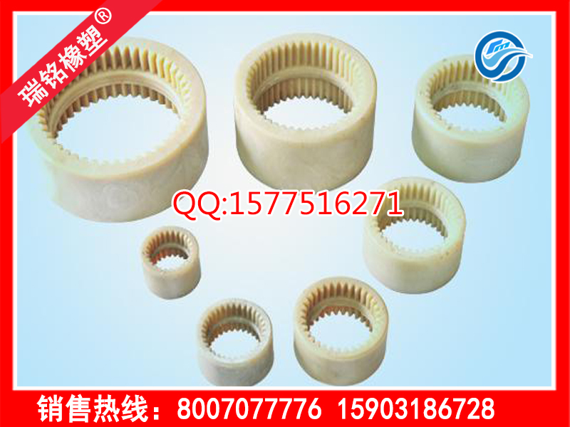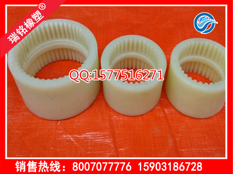 尼龙内齿圈是由带外齿的凸缘半联轴器和齿数相同的内齿圈等零件组成。外齿分为鼓形齿和直齿两种齿形,所谓鼓形齿尼龙内齿圈即为将外齿制成球面,球面中心在齿轮轴线上,齿侧间隙较一般齿轮大,鼓形齿尼龙内齿圈联轴器可允许较大的角位移(相对于直齿联轴器),可改善齿的接触条件,提高传递转矩的能力,延长使用寿命。