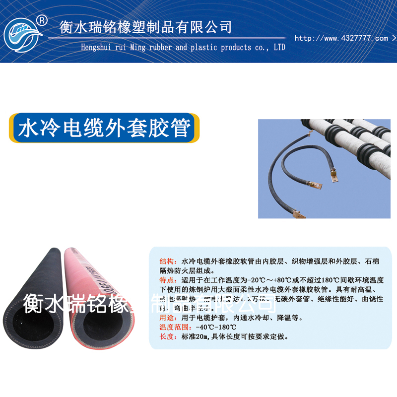 水冷电缆外套胶管适用于在工作温度为-20℃~+80℃或不超过150℃间歇环境温度下使用的炼钢炉用大截面柔性水冷电缆外套橡胶软管。具有耐高温、耐电辐射热、耐电击穿达3万伏、无碳外套管、绝缘性能好、曲饶性好、绝缘材料弯曲半径小。